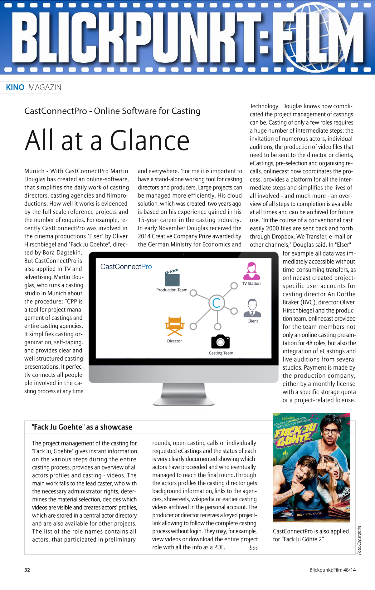 Today, CastConnectPro is an internationally used online tool that helps hundreds of casting directors, directors, film productions, commercial casters, casting agencies, and extras agencies worldwide to work more efficiently and organize projects effectively.